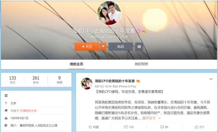 海航CFO史禹铭被发妻举报偷税漏税、诈骗及出轨