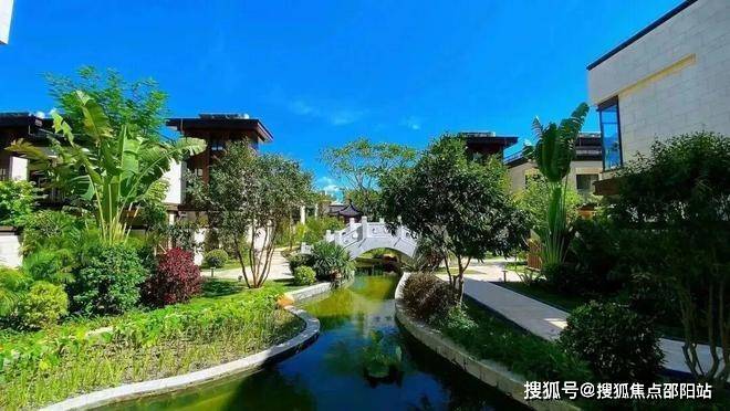 中央水系景观以逐浪庭,渠水庭,银锭桥,浮云庭,月亮门,结合三亚丰富的热带植被花卉进行绿化铺陈,打造中正大气、绿意盎然、小桥流水、生机勃勃动静结合的项目建筑景观全系风貌。