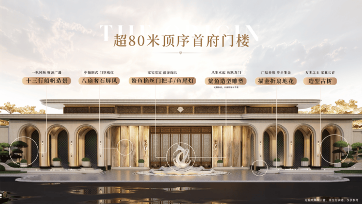 横跨80米、纵高13米的上亿奢宅大门营造超尺度视觉震撼,中西兼容的门第仪制,彰显对百年首府花园的致敬与回归,同时给予业主直观的体量感、尊崇感与文化感。