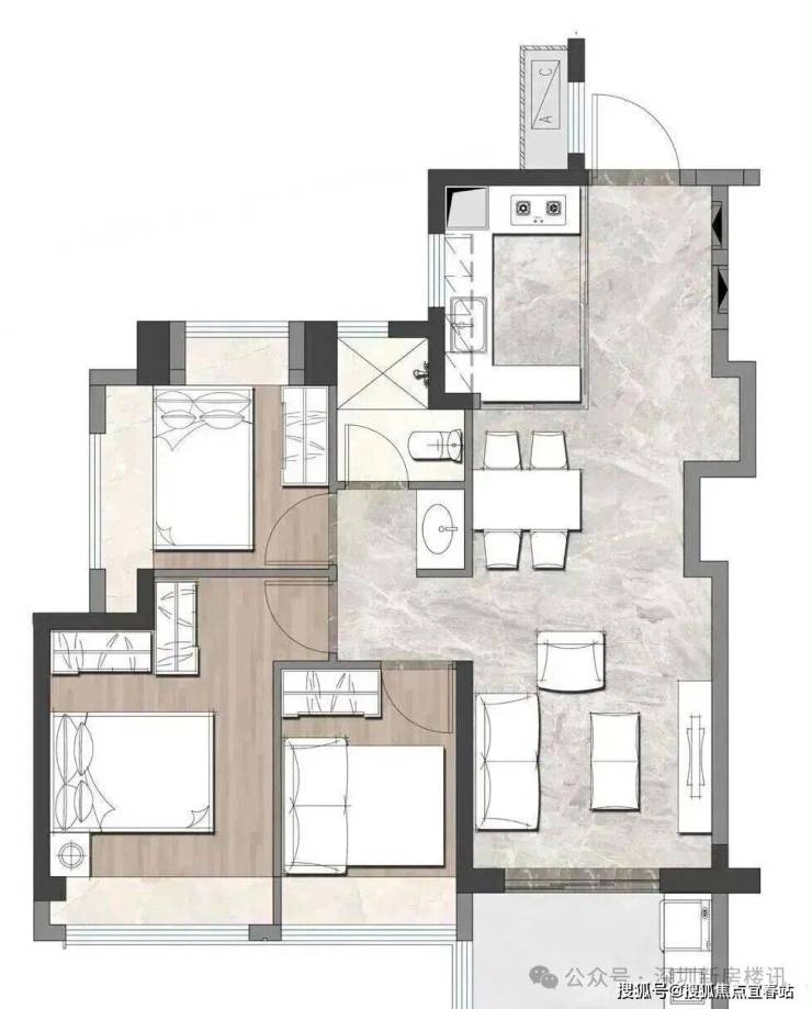 约79㎡三房一卫是是传统竖厅三房结构,同样具有低总价优势,除厨房和小卧室外,其它功能间都是优势朝向。需要注意的是小卧室虽然不是优势朝向但是双面采光双飘窗的。