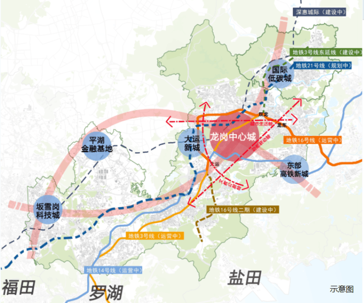 在龙岗发展一路向东的大趋势下,依托地铁3/16/14号线的轨道交通效能,“东部副中心”强势崛起,地铁16号线东轴方向成龙岗中心城外拓首站,“一芯两核多支点”战略赋能、超百万方城市更新推进,多重势能叠加,区域未来可期①。