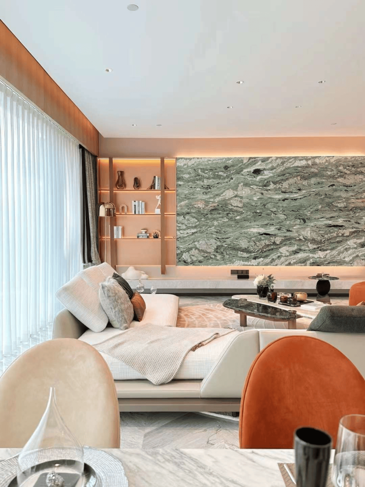 客厅背景墙更像是一场世界顶级石材展览,西边套用的是巴西进口石材天宝石,高贵中带着优雅;东边套用的是意大利卡拉拉大理石中的顶级「雕刻白」系列,我们熟知的世界著名雕塑《大卫》雕塑、世界著名建筑比萨斜塔等等,用的就是这一种石材。