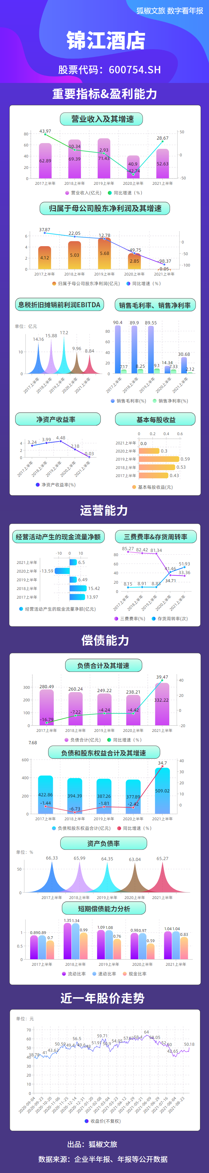 运营能力方面,本报告期内,锦江酒店经营活动产生的现金流量净额为13.97亿元,为5年同期第二高位;负债合计为322.22亿元,创5年新高,资产负债率为65.27%,对比5年内同期数据稳定,短期偿债能力较强。