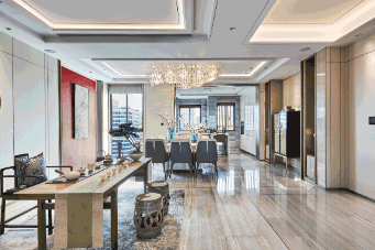 餐厅与茶室融合的设计,形成约40㎡的复合社交空间,无论是家庭聚会还是商务会谈,都能获得独立而从容的场域。双主套三卫的配置,进一步提升居住的舒适性与尊崇感,使每位家庭成员都拥有相对独立的生活空间。