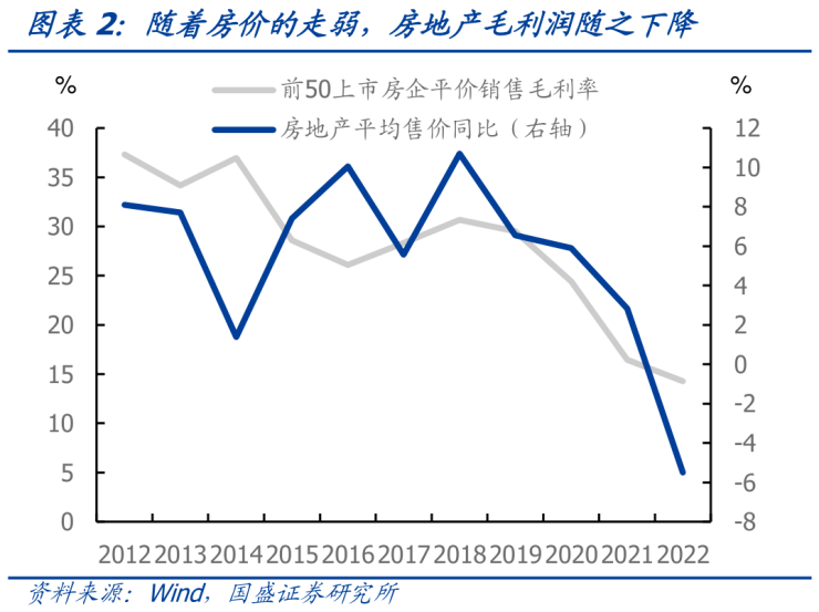房地产销售收入的下滑导致经营收入大幅下降,最终导致净利润的下降,并成为房地产资金缺口形成的主要原因。今年房地产销售额预计同比跌幅在25%左右,将从去年的18.2万亿下降到今年的13.5万亿左右。在收入下降的同时,费用率却在普遍上升,前50上市房企平均的滚动期间费用率从2019年的8.5%上升至今年年中的12.9%,对应着毛利率的下滑,前50上市房企平均滚动毛利润率从2019年29.5%下降至今年年中的14.3%,其中房价涨幅放缓是主要原因。商品房平价销售价格在2019年同比增长6.6%,而在今年,预计将同比下跌5.5%。这导致房企经营利润的下降,从前50上市房企数据来看,今年净利润率跌幅将进一步加大,预计今年行业净利润可能低于-1万亿,我们预计可能达到-1.4万亿。