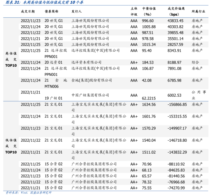 除去2个月以内到期、估值偏离小于100BP的债券,在信用债窄幅口径(企业债+公司债+中票+短融+PPN)下,本周高估值成交债券数量为951只,较上期增加285只,且建筑装饰和综合高估值成交个券最多,分别有217只和210只;低估值成交债券数量为635只,较上期增加73只,且房地产,建筑装饰低估值成交个券最多,为230只和169只。