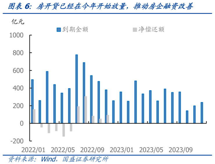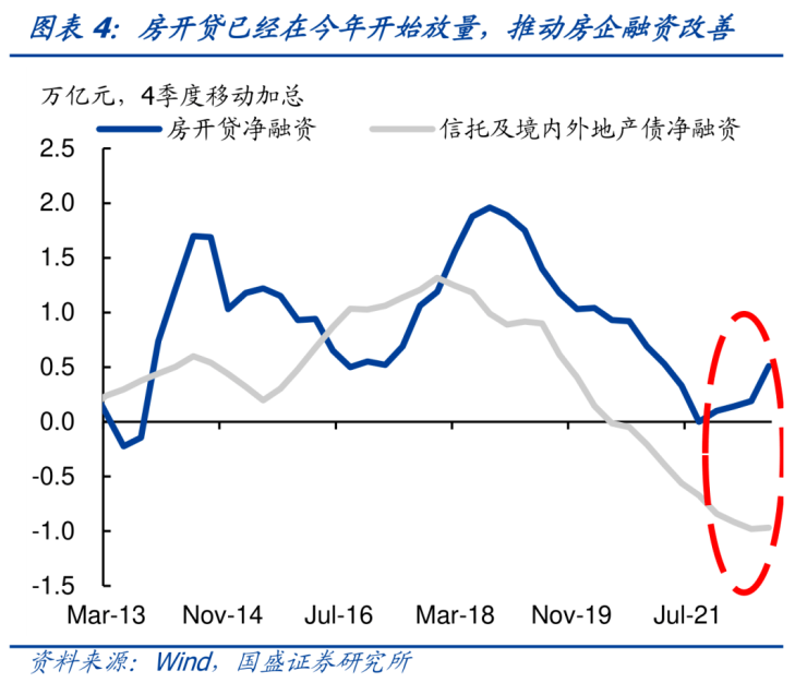 而从融资端来看,事实上今年房地产行业融资端是改善的,特别是房开贷增加,已经抵消了其他负债的下降,融资规模甚至已经转正。今年前3季度,房开贷已经大幅增加,考虑到4季度进一步加大发放,全年房开贷新增规模预计在9000亿元左右。而今年投放房地产的信托贷款上半年大幅减少,下半年考虑到信托贷款减少节奏放缓,假定3季度房地产信托贷款变化与总的信托贷款一致,并且4季度不再减少,那么全年房地产信托贷款将减少4300亿元左右。境内地产债今年融资基本平稳,预计全年净融资在-600亿元左右,而美元债净融资额今年明显转负,全年净融资预计在-3000亿元左右。各项相加之后,房开贷弥补了其他融资的收缩,房地产行业净融资额在今年有望转正至1200亿元左右。这主要是房开贷政策的大力支持带来的结果。