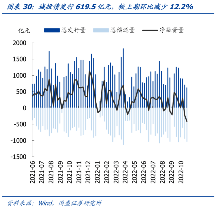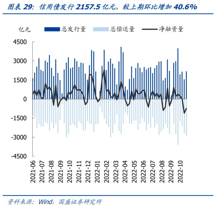 本周信用债发行2157.5亿元,偿还2892.5亿元,净融资-735.0亿元,发行量(38.4 %)位于近三年历史较低水平,偿还量(80.0 %)位于近三年历史较高水平,净融资量(4.7 %)位于近三年历史较低水平;城投债发行619.5亿元,偿还1033.6亿元,净融资-414.1亿元,发行量(13.4%)位于近三年历史较低水平,偿还量(92.3%)位于近三年历史较高水平,净融资量(0.0%)位于近三年历史最低水平。