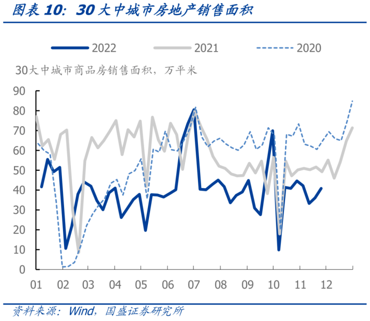从行业运行来看,销售端是对行业运转最为重要的指标。销售端改善将直接提升销售收入,并且通过价格上升提升毛利润率,这对企业的资金改善是最为直接有效的,而且也是最具有持续性的。而销售端不景气情况下,融资端改善,则是用融资资金去弥补销售端形成的资金缺口,这往往难以带来行业整体的资金改善。对应的,房地产投资也不会有明显的增长。结合今年新开工、土地购置的情况,我们预计明年地产投资可能继续负增长。即使短期保交楼等因素可能缓解投资下行,但由于幅度有限,而且不解决行业运转问题,因而持续性有限。在保交楼涉及2万亿平,单位面积建筑成本为4000元/平的假设下,保交楼带动的投资为8000亿元,占年度投资的比例为6.0%,并不能改变整体投资走势。