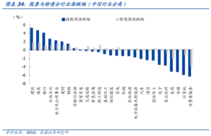 转债小幅反弹。本周转债分行业来看,建筑、煤炭和电力及公用事业转债涨幅最大,分别上涨1.67%、1.64%、1.51%,消费者服务、医药和计算机转债跌幅最大,分别下跌3.72%、1.93%、1.16%。
