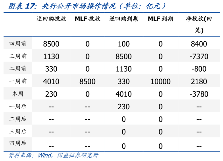 本周逆回购投放230亿元,MLF投放0亿元,逆回购到期4010亿元,MLF到期0亿元,因而央行净回笼3780亿元。