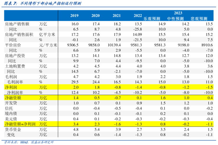 但融资改善并不意味着整个行业现金流的改善,需要结合经营性现金流一起观测。从目前来看,在需求端政策不足情况下,地产销售依然保持相对疲弱态势。目前地产销售依然是下跌状态,如果假定明年地产销售改善,基准情形下假定地产销售增长5%,地产销售额依然只有14万亿左右,行业经营性现金流可能依然为负。因为考虑到房价目前的弱势,以及需求偏弱情况下短期明显回升可能性有限,因而明年毛利润率存在进一步下行可能,我们估计毛利润率可能从今年上半年滚动14.3%水平下降至明年13%左右的水平,净利润率由于融资成本下降可能有所回升,但大幅回升空间有限,明年基准情形下我们假定回升至-8%,则对应的净利润为-1.2万亿。可以看到,基准情形下,房地产净融资增加1万亿基本上弥补经营-1.2万亿的缺口,因而对整个行业改善幅度有限。