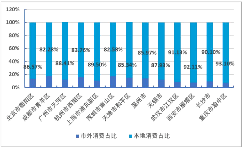 居民对文化和泛娱乐类供给消费意愿高涨,主客共享美好生活空间。从都市休闲消费业态结构来看,除日常消费外,文化和泛娱乐类供给的消费占比较高,北京、西安文体娱业态的消费占比达到了22.53%和22.1%,体现出文化和泛娱乐类产品供需配给更为合理。同时剧本杀、密室逃脱等各类泛娱乐业态发展迅速。从本地与市外游客的消费占比来看,本地居民对本地都市休闲消费的贡献超8成。