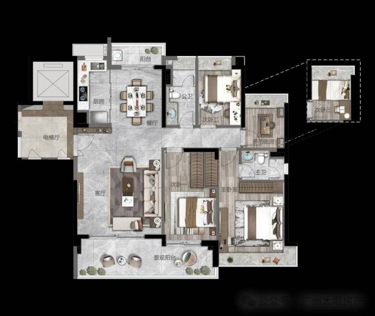 设计大师梁志天团队、汉森伯盛等知名团队打造,华为智能化系统配置,全屋 VRV 多联机空调等高品质交标。