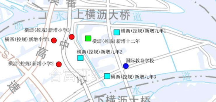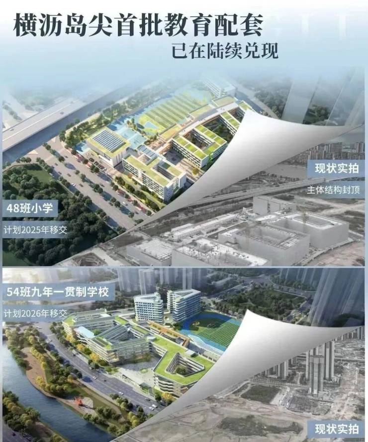 横沥岛上规划小学3所、九年制学校3所、十二年制学校1所,国际学校1所;其中,1所54班九年制学校(2026年投用)及1所48班小学(2025年投用)已获批建设。