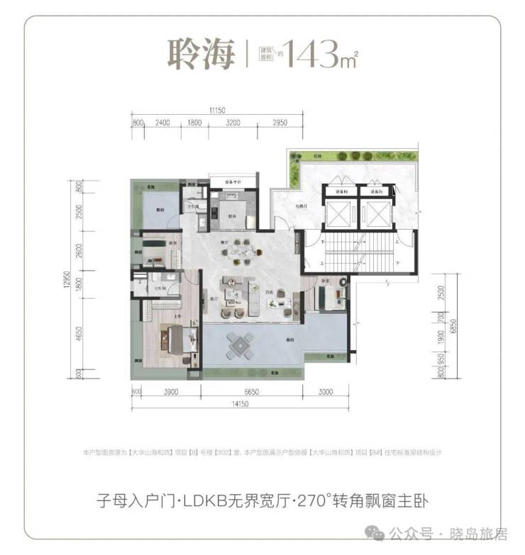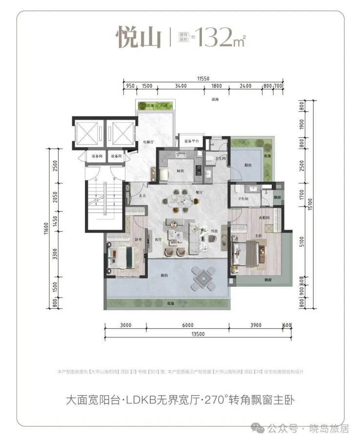 建面132㎡悦山户型:LDKB无界宽厅设计,大面宽阳台延伸生活空间,主卧270°转角飘窗,最大化吸纳山海景观。