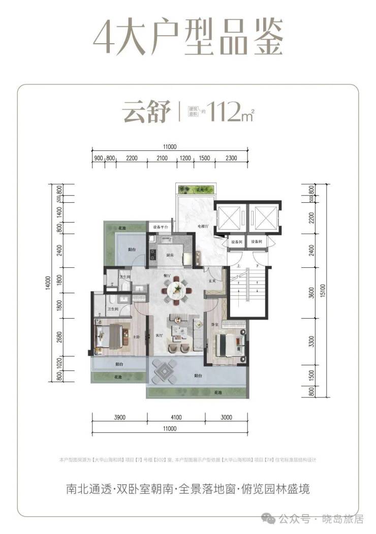 建面112㎡云舒户型:南北通透,双卧室朝南搭配全景落地窗,俯览园林盛境,空间利用率高,适合三口之家旅居。