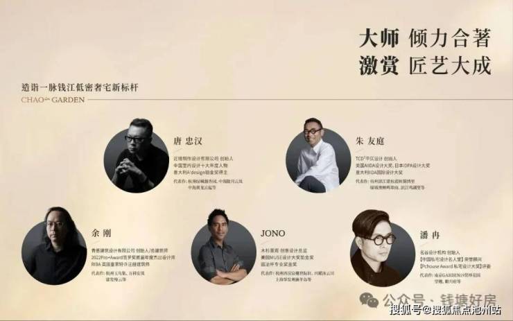 力邀近境制作创始人唐忠汉、TCD²平仄设计创始人朱友庭、木杉景观创意总监JONO、名谷设计创始人潘冉、青墨建筑设计创始人余刚5位设计名家重磅携手。集匠艺之大成,共筑金沙湖当代奢宅新标杆。