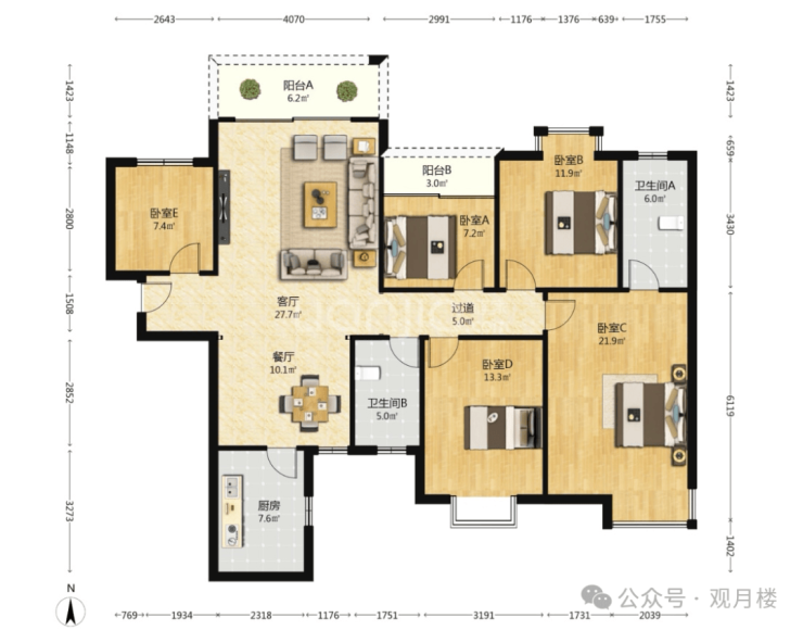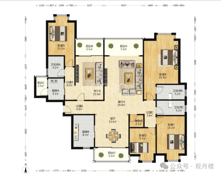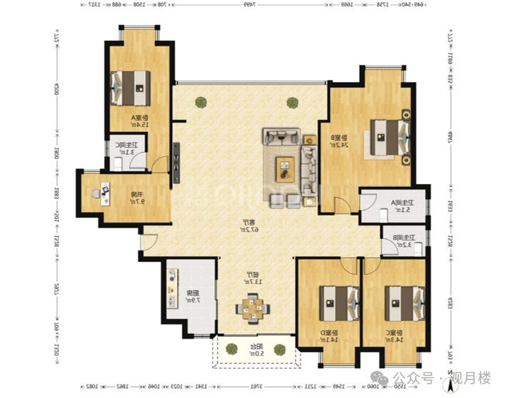 162㎡户型有五个卧室,适合大家庭居住,也是头排江景,客厅开间4米,主卧面积达21㎡,再多的衣服包包都放得下。