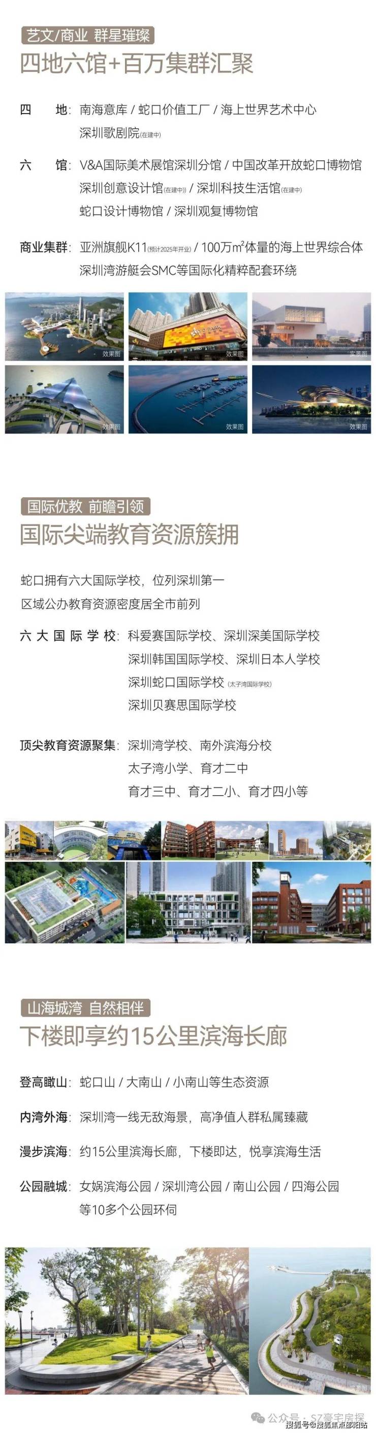 商业配套:项目自带约 5 万平方米的商业设施,由华润运营,周边还有海上世界、海岸城等高端商业配套。