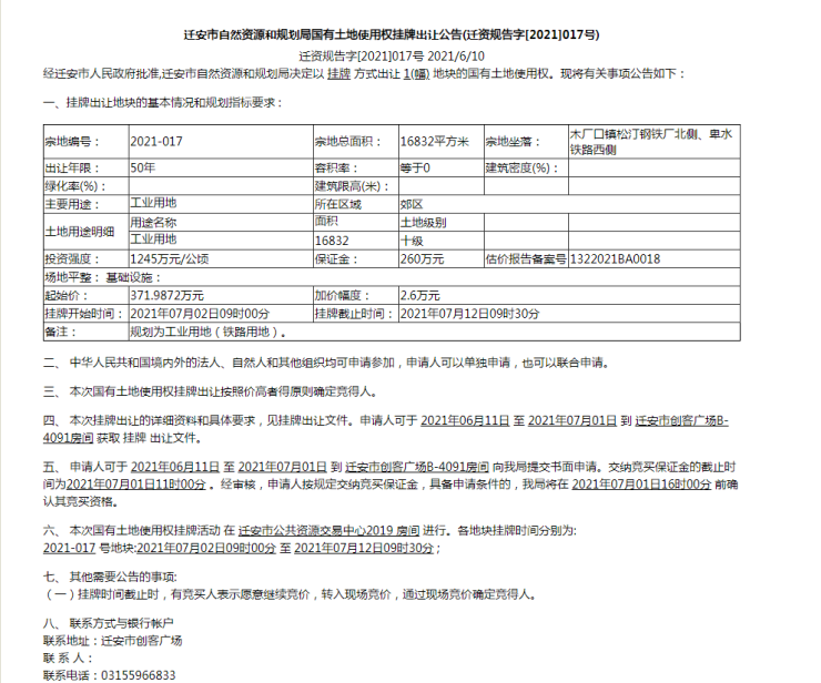 迁安市自然资源和规划局国有土地使用权挂牌出让公告(迁资规告字[2021]017号)