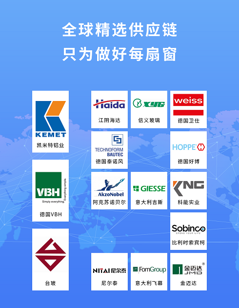 为保证产品质量,19分贝门窗目前已形成了完善的供货渠道,大批量采购降低了材料成本,而且所有配套供应商均选择行业先进,与德国HOPPE、意大利吉斯、荷兰阿克苏诺贝尔、德国卫仕等多家供应商形成战略合作关系,始终如一地为客户提供质量上乘、品质优良的高性价比产品。