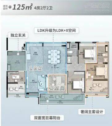125㎡四房在舒适性上进一步提升,四开间朝南,阳台长度达到6米,连接客厅与次卧,主卧配备独立衣帽间和干湿分离卫生间,动静分区清晰,适合改善家庭 。