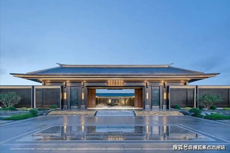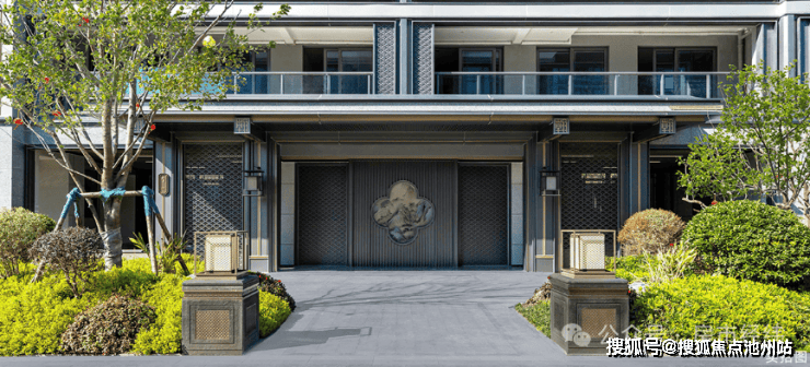 恢弘规制大门,铜船雕塑,与龙舟基地相呼应,彰显中式大宅厚重,寓意一帆风顺的美好祝愿。