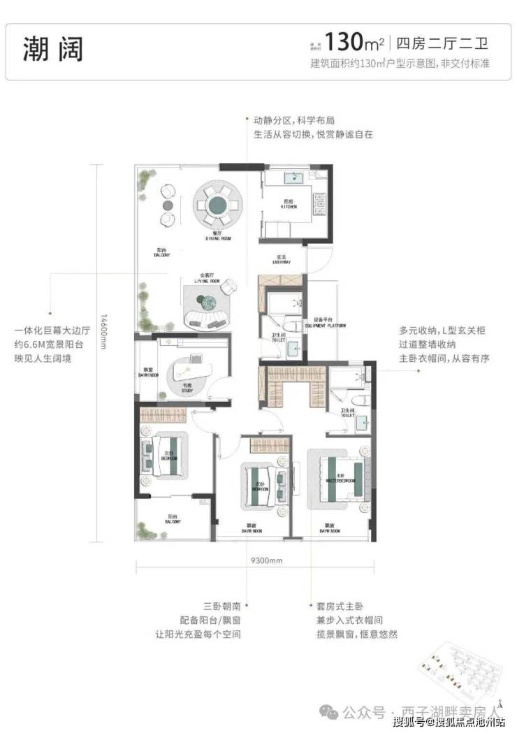 项目首批将推出定位300万级的墅区小高层。其中,建面约105平方米产品实现了“四开间朝南”的赏景格局;约127平方米户型则打造了独特的L型阔景视野;约130平方米户型更实现了“环景全面屏”般的观感,力求让约2.1万平方米中央公园成为家中日常的风景。