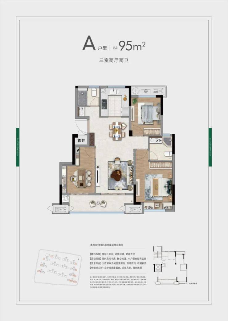 甚至,哪怕是建筑面积约95㎡的小户型房源,也是南北通透的双联阳台+双卫格局,不仅功能强大,还可以实现隐私保护。