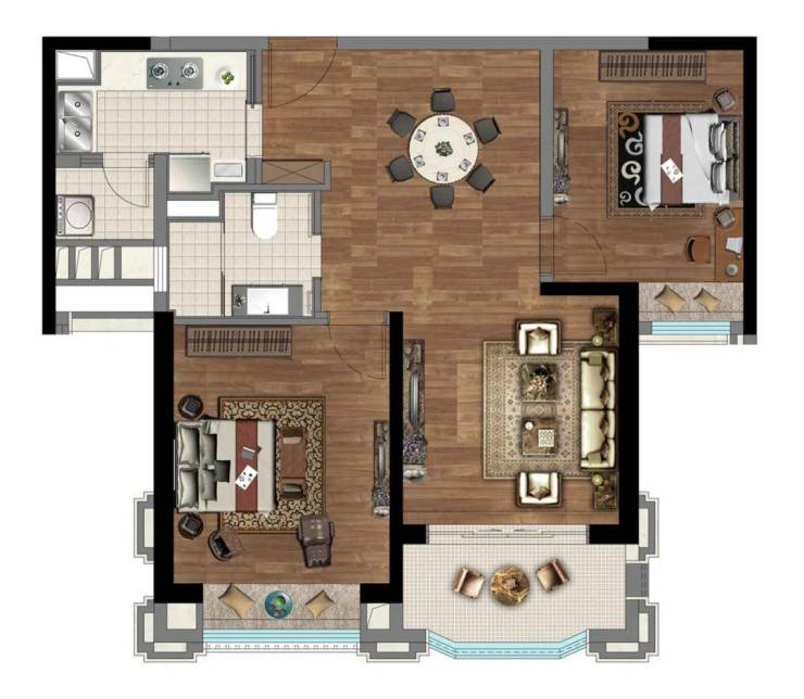 建面约95㎡2房,创新户型,全明设计。在一体化设计的客餐厨阳台中,一家人平时聚在其中,无论是坐在沙发上歇息、在厨房中烹饪、在饭桌上吃饭,窗外的风景都是生活的点缀。