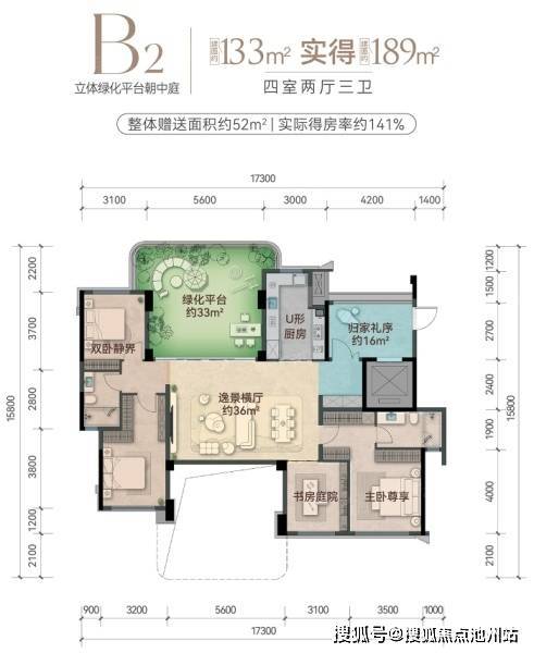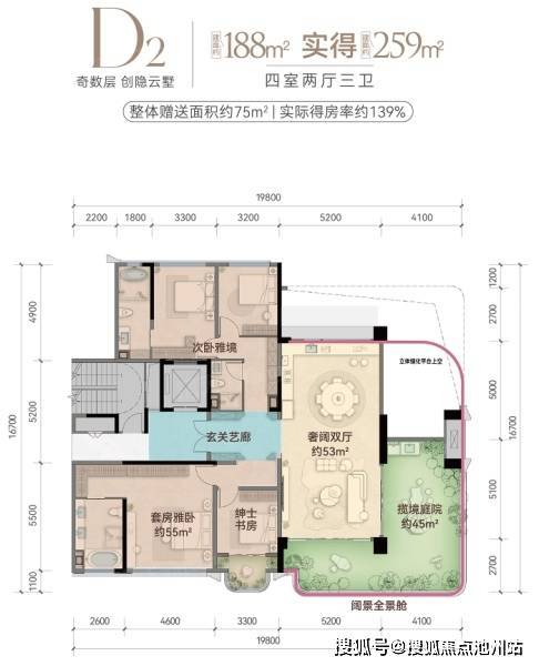 建面约 210㎡户型:四室两厅四卫一岛院,客厅加花园面积约 101 平米,庭院面积约 47 平米,挑空约 6.3 米,主卧旁有私密岛院,面积约 14㎡,可将室外景观引入室内,做到了合理的动静分区,为业主提供舒适、互不干扰的生活空间。