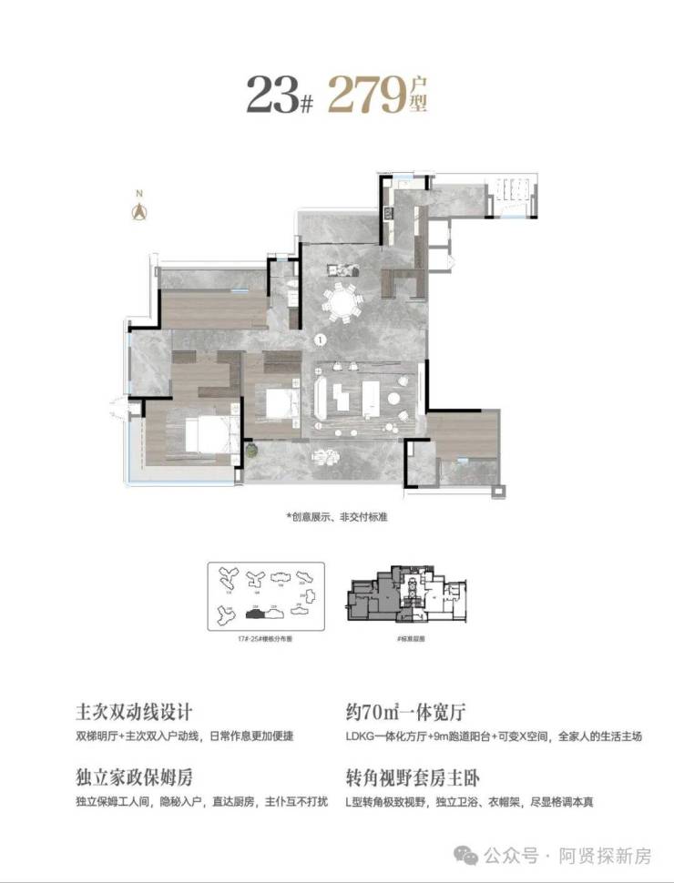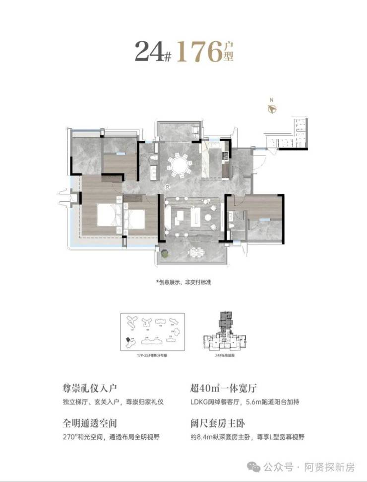 ——基本信息——【项目规模】占地共约24万m²/建面约98万m²【项目业态】24栋住宅、多栋商办,配建托儿所、幼儿园及中小学【项目户数】住宅共约1780户【在售产品】二期住宅17-24#176-279㎡新派科技豪宅
