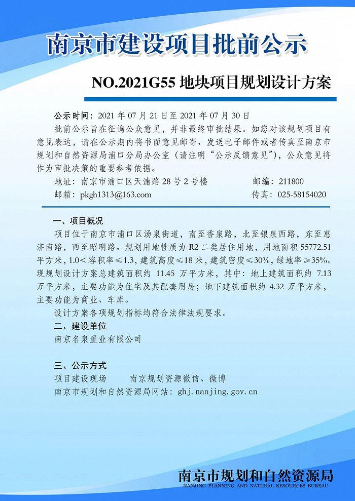 近日,南京市规划和资源局官网公示了江北新区NO.2021G55项目规划设计方案。项目位于南京市浦口区汤泉街道,南至香泉路,北至银泉西路,东至惠济南路,西至昭明路。