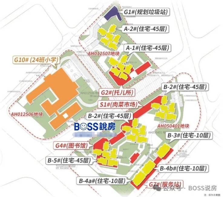 项目主要分为南北地块来规划,北地块规划了2栋超高层洋房,托儿所和24班宝玉直小学,南地块规划了3栋超高层洋房,2栋小高层板楼、和图书馆。