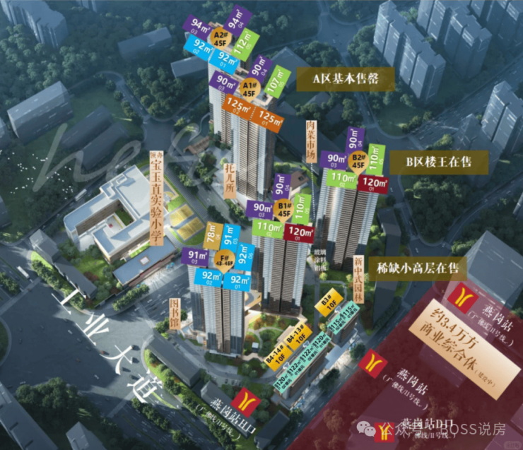 项目位于广佛线+广州地铁11号线-燕岗站地铁上盖,距离地铁 H 出口直线约100米的位置