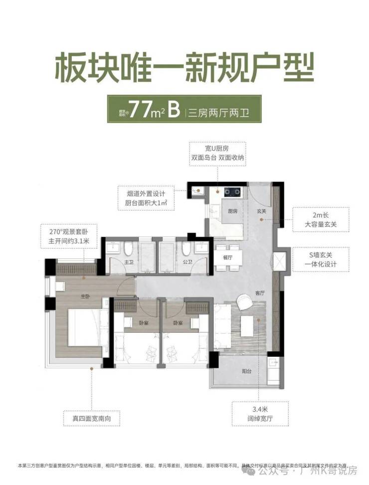 三面宽南向,并通过270°全景舱主卧,客厅已经做了LDK公区方案,