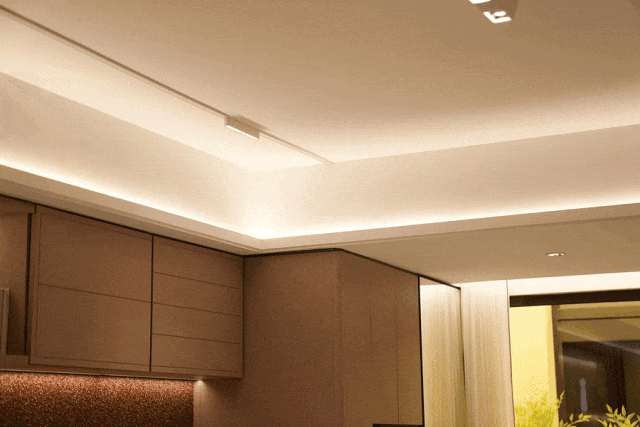 厨房天花板与客厅灯带边缘,都采用弧形设计,有舒缓柔和之美,待在这样的空间里,心情也会舒畅很多。