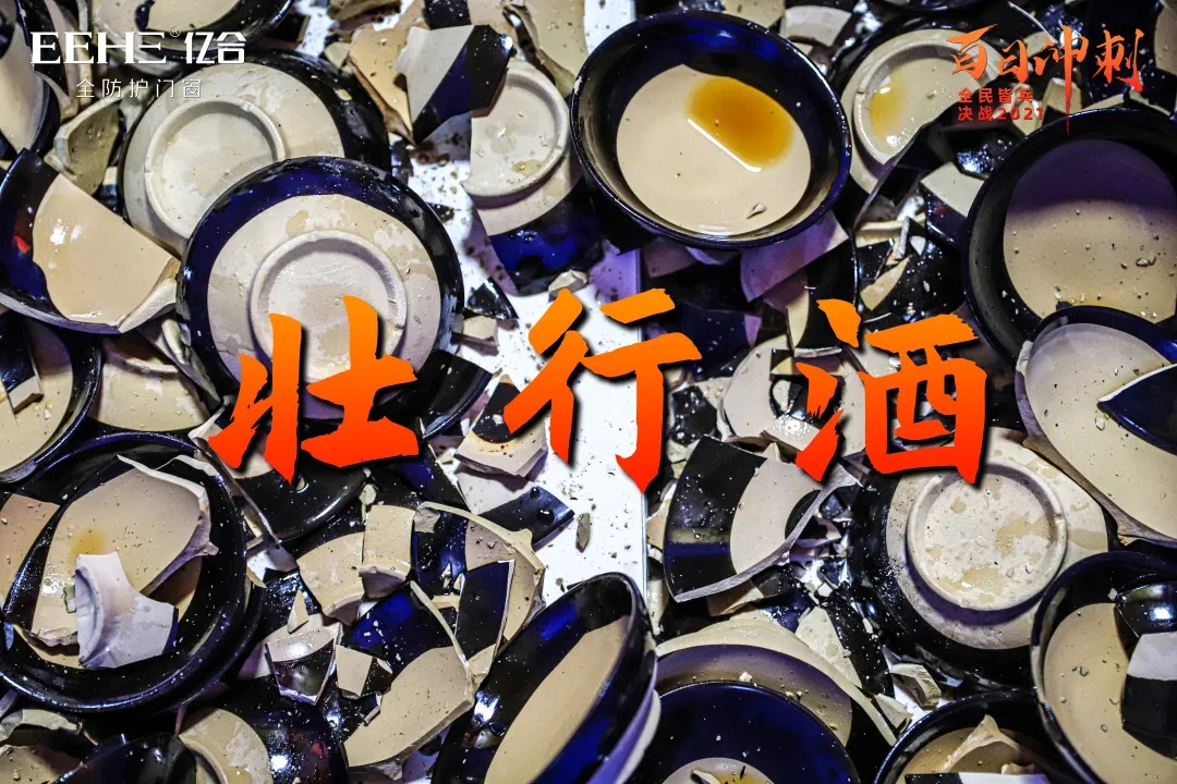 战鼓雷动,号角吹响,排山倒海般的气势席卷会议现场。在此,亿合战士们喝下壮行酒,象征着百日冲刺战火彻底点燃。壮行酒尽,旗开得胜;摔下酒碗,志在必得。战士们满腔热血,以更加坚定的信心,更加昂热的斗志,迎着2021年底目标不遗余力地进军,用战绩,捍卫荣誉!