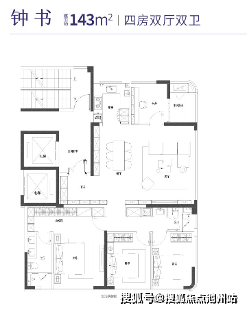 (钟书,143m²4房2厅2卫)边户户型,三开间朝南,保障了充足的日照与南向面宽;明厨明卫,双面采光,通风俱佳。户型实现了明确的动静分区,北向书房结合生活阳台,形成独立家政区。设计上摒弃无效过道,空间动线高效,得房率表现优异。
