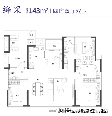 (绛采,143m²4房2厅2卫),南北通透与三面采光。采用大横厅设计,连接南向双卧,空间开阔明亮。功能上兼顾独立玄关区与实用生活阳台,集通透性、功能性与尺度感于一体。