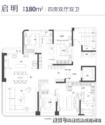 (启明,180㎡ 4房2厅2卫)为2号楼特有。L型南向转角阳台,提供了较好的采光和观景面。布局上,将带室内生活阳台的父母房设于北向,兼顾了长辈的隐私与生活便利性。不过对于约180平方米的四房户型而言,仅配置两个卫生间,在使用高峰期可能存在不便,是需要潜在买家权衡的方面。