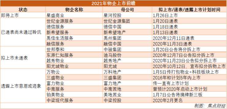 来到2021年,物业上市潮热度不减。焦点财经统计,于2021年计划上市或可能上市的物业企业共16家。