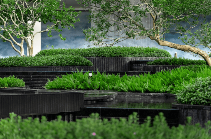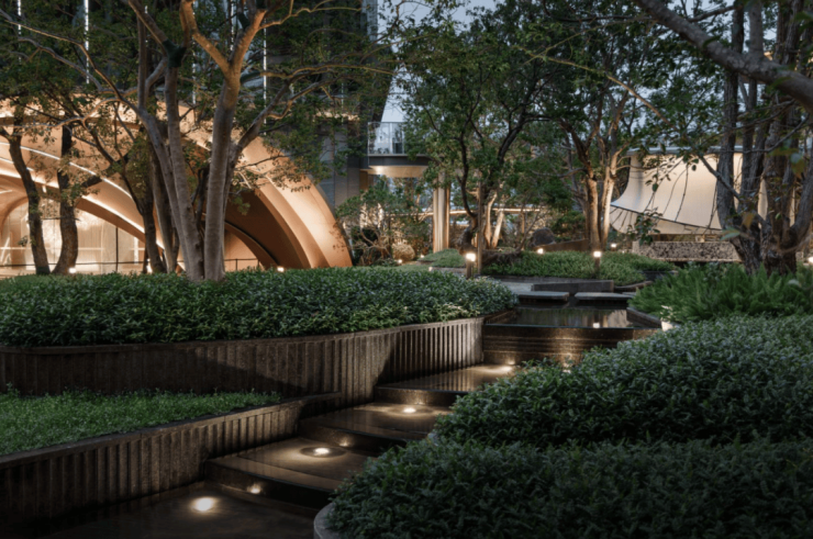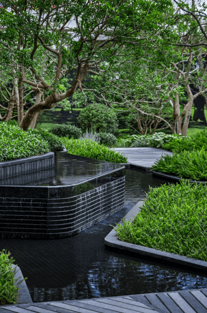 水流从入口叠水瀑布倾泻而下,奔向中央镜面水池,再沿着步道溪流蜿蜒流至全园各处,业主们沿着步道漫步,能依次体验 “听水的舒缓、观水的灵动、亲水的惬意”,这是传统平面园林没有的感受。