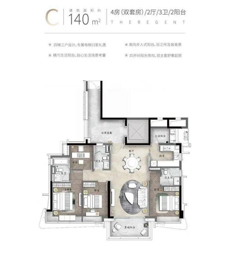 产品亮点:私家电梯入户、约3.4米层高、动静分区南北对流、约6.8米挑空餐客厅、中西双厨、三套房设计、部分房间带阳台设计