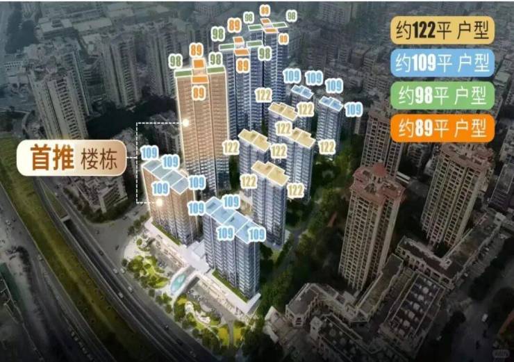 1、首推1、11栋,89-98-109-122㎡三至四房,使用率超100%。共规划了11栋住宅,3栋塔楼、8栋板楼,2T2板楼、2T4塔楼,全南向设计,覆盖刚需和改善客群。