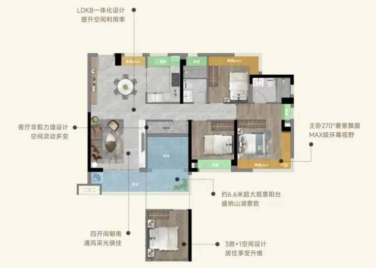 入户是餐厅,隔壁是厨房,客厅、3间卧室位于南侧,阳台连通次卧,长约6.3米,主卧三面墙都打造有飘窗,采光非常牛。