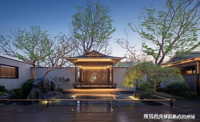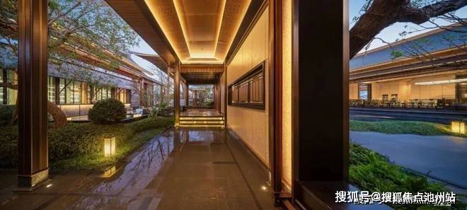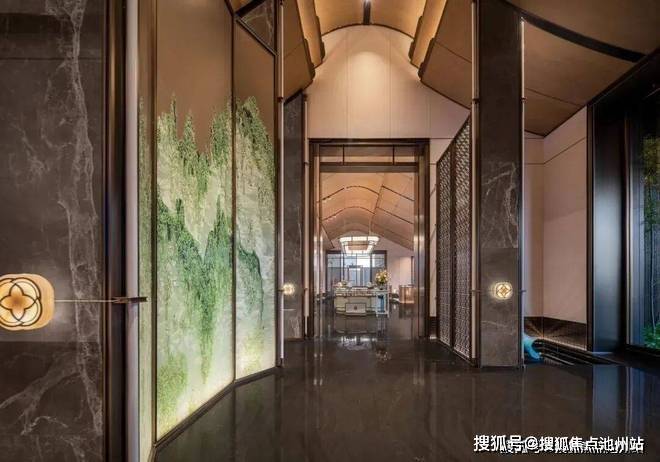 一进门・入境《千里江山图》。大门以《千里江山图》为灵感,采用宋制门堂对称格局,重檐坡屋顶展现极高规制。含两侧景墙总长约63米,两侧全冠移植的罗汉松与镇宅石麒麟,气势恢宏。