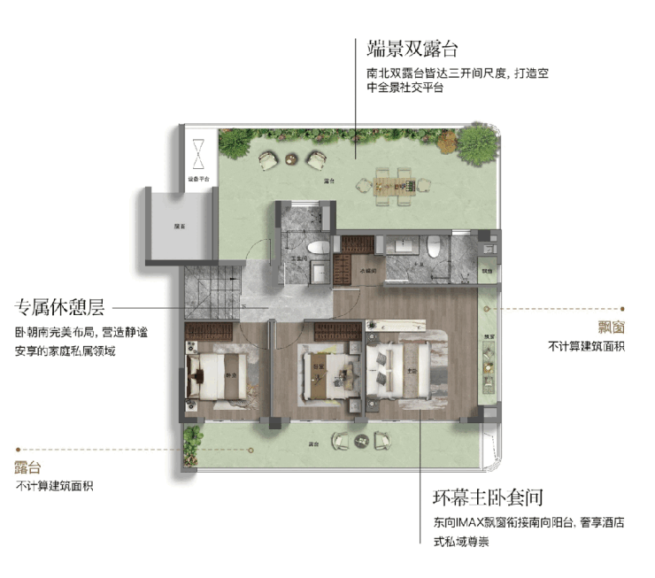 如果说112㎡户型是平面空间的极致利用,那么约144㎡的上叠户型则开启了垂直生活的无限遐想。其建筑面积约144㎡,但通过巧妙的挑空、露台及灵动空间设计,实际可使用面积高达约180㎡,实得率约125%,价值感瞬间拉满。
