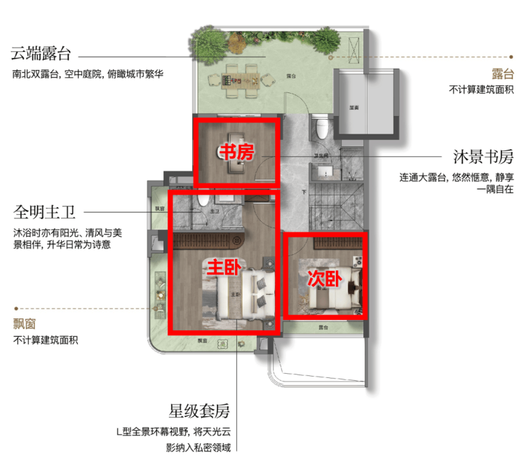 地上两层从容布局,满足多代同堂的居住需求。特别是二层南向的超尺度主卧套间,配备270°环幕视野、独立卫浴及衣帽间,其奢华体验堪比顶级酒店套房。主卫亦享有270度转角飘窗,让日常洗漱成为一种景观享受。